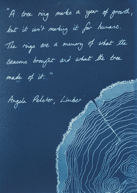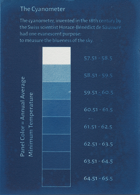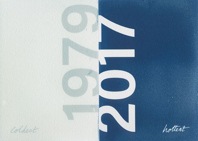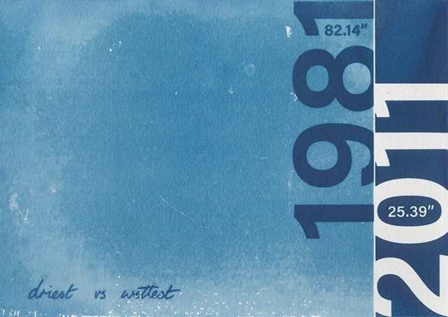 “the present of my life looks different under trees” is an exhibition of sixty cyanotypes, each one reflecting a summary of that year’s weather in Houston, Texas. The changes over 60 years are startling and the installation, which surrounds the viewer, brings these changes to the fore.
