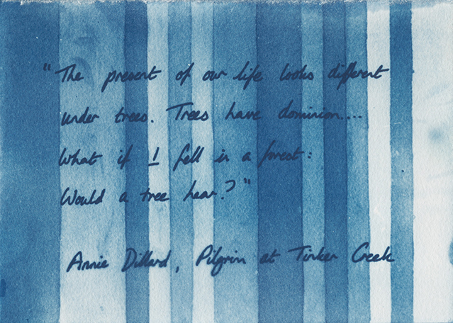 A set of three unique 5 by 7 inch cyanotype prints, signed on the reverse by the artist. These prints have been made to accompany the exhibition “the present of my life looks different under trees”.